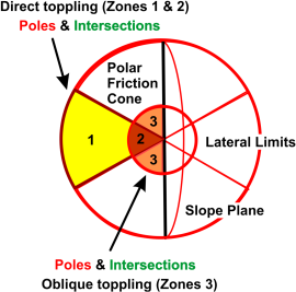 The following table and diagrams provide background information explaining the types of failures, critical zones, and examples of relevant stereonet diagrams.