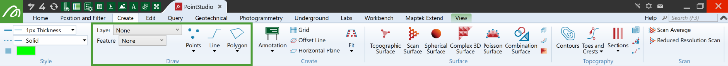 The Draw group tools of the Create tab enable you to draw points, lines, and shapes in your project, as well as sorting them into layers and applying features.