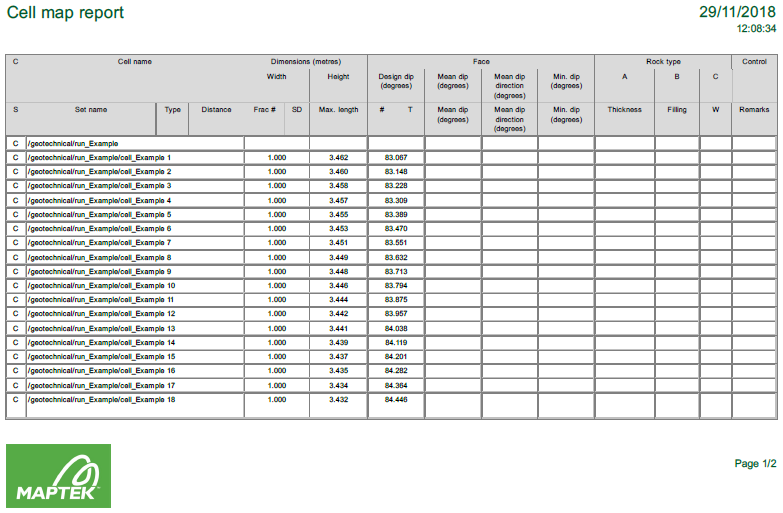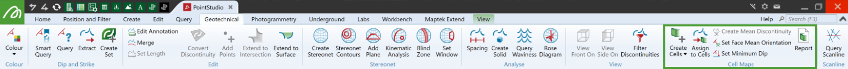 The Cell Maps tools on the Geotechnical tab enable you to arrange discontinuity objects in cells around a pit, and then produce a report detailing various important characteristics within user-defined cells.