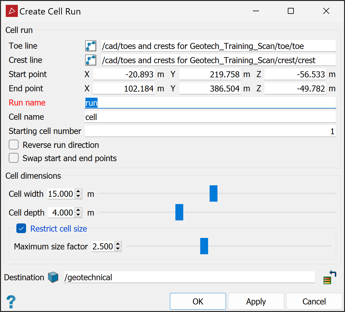 Restrict cell size. Choose whether cells will be created between the crest and toe line if they are more than Maximum size factor times larger than Cell width or Cell depth. Enter a value for the Maximum size factor.
