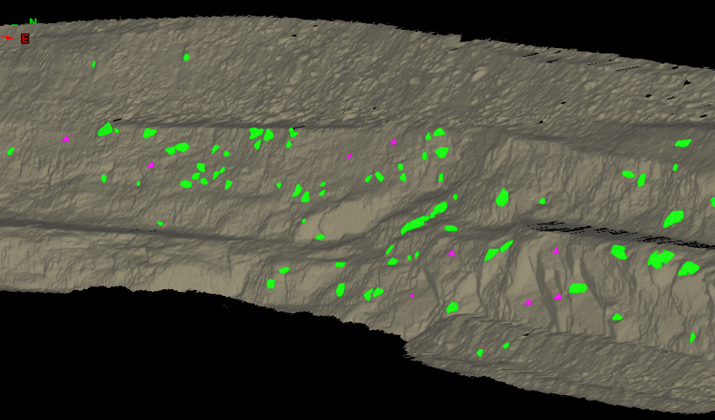 This tool uses the section of pit face or wall contained within a cell to calculate a mean face orientation. The mean orientation value is then assigned to the cell. This quantity and others can be retrieved using the cell map report tool. See Cell map report.