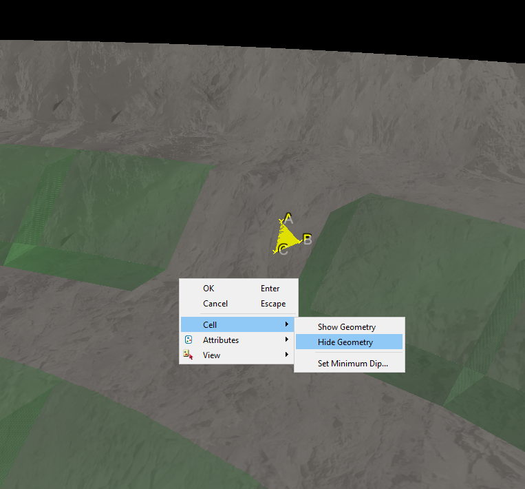 Note: You can also hide geometry to assist the process of picking pit surface points by right-clicking on the cell to open the context menu and clicking Cell > Hide Geometry.