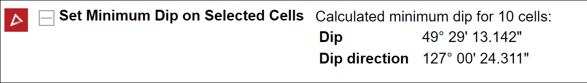 This tool allows you to set a minimum dip value for a cell. You can enter values or select three points on the pit wall or surface that represent the plane of the minimum dip value. This quantity and others can be retrieved using the cell map report tool.