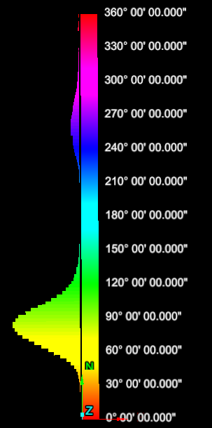 The above image displays the dips and strikes coloured according to their angle trends, corresponding to the histogram. |