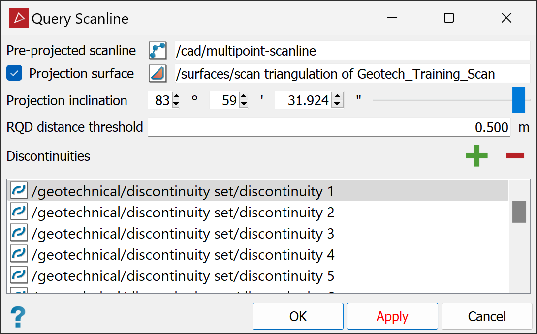 Draw a scanline on the rock face (see Lines). The line can be either a single segment defined by two points or a multi-point line. Refer to step 3, below.