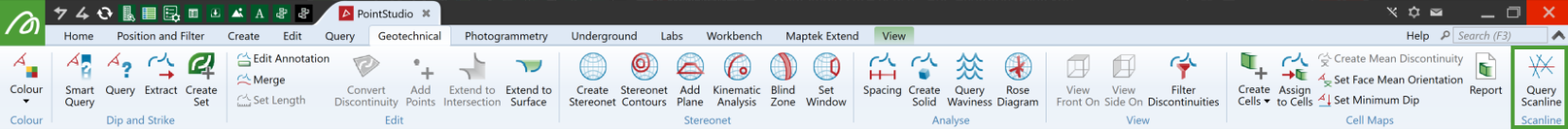 The Scanline tool on the Geotechnical tab enables you to report on discontinuities along a scanline on a rock face.