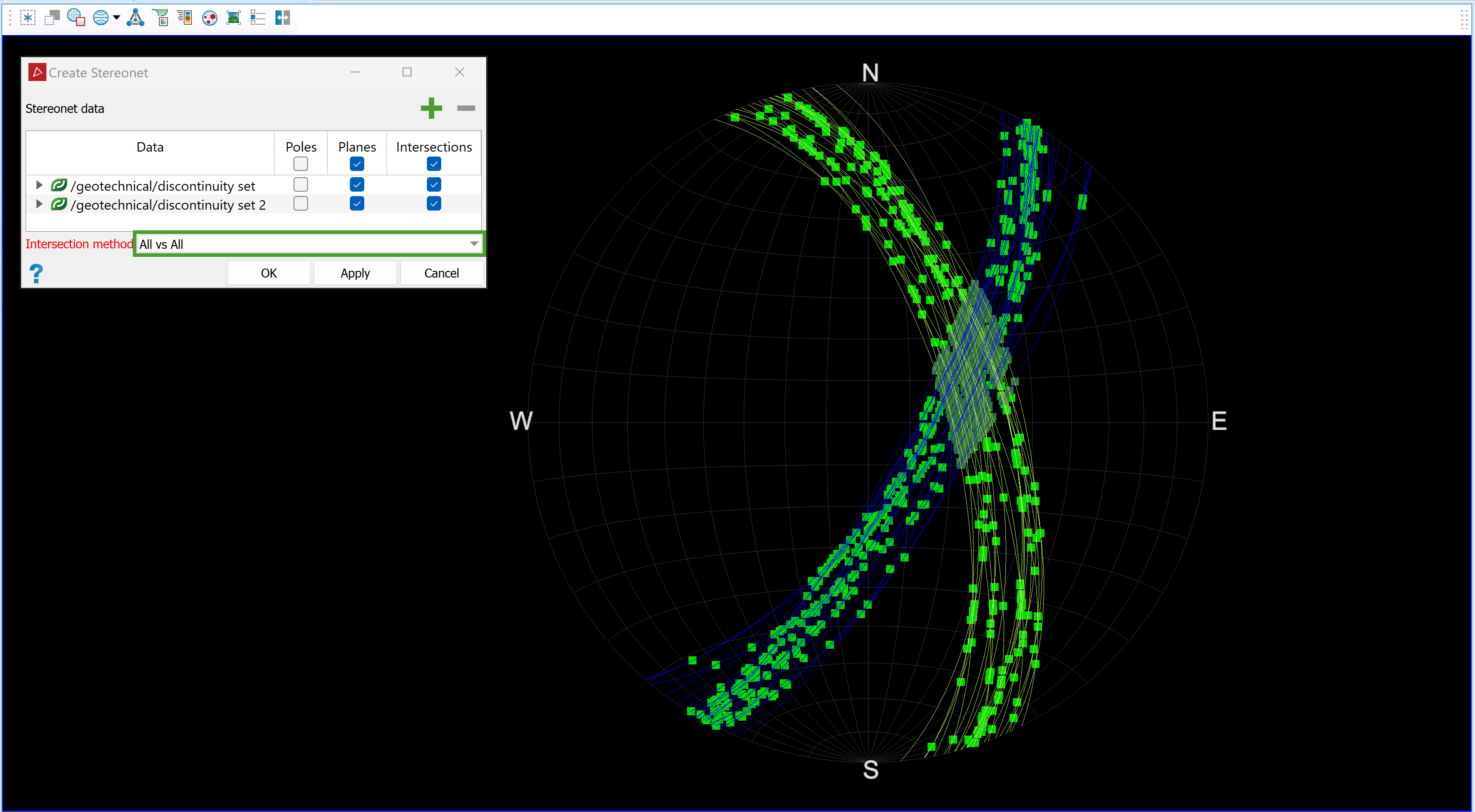 All vs All: The stereonet tool will generate intersections between all discontinuities.