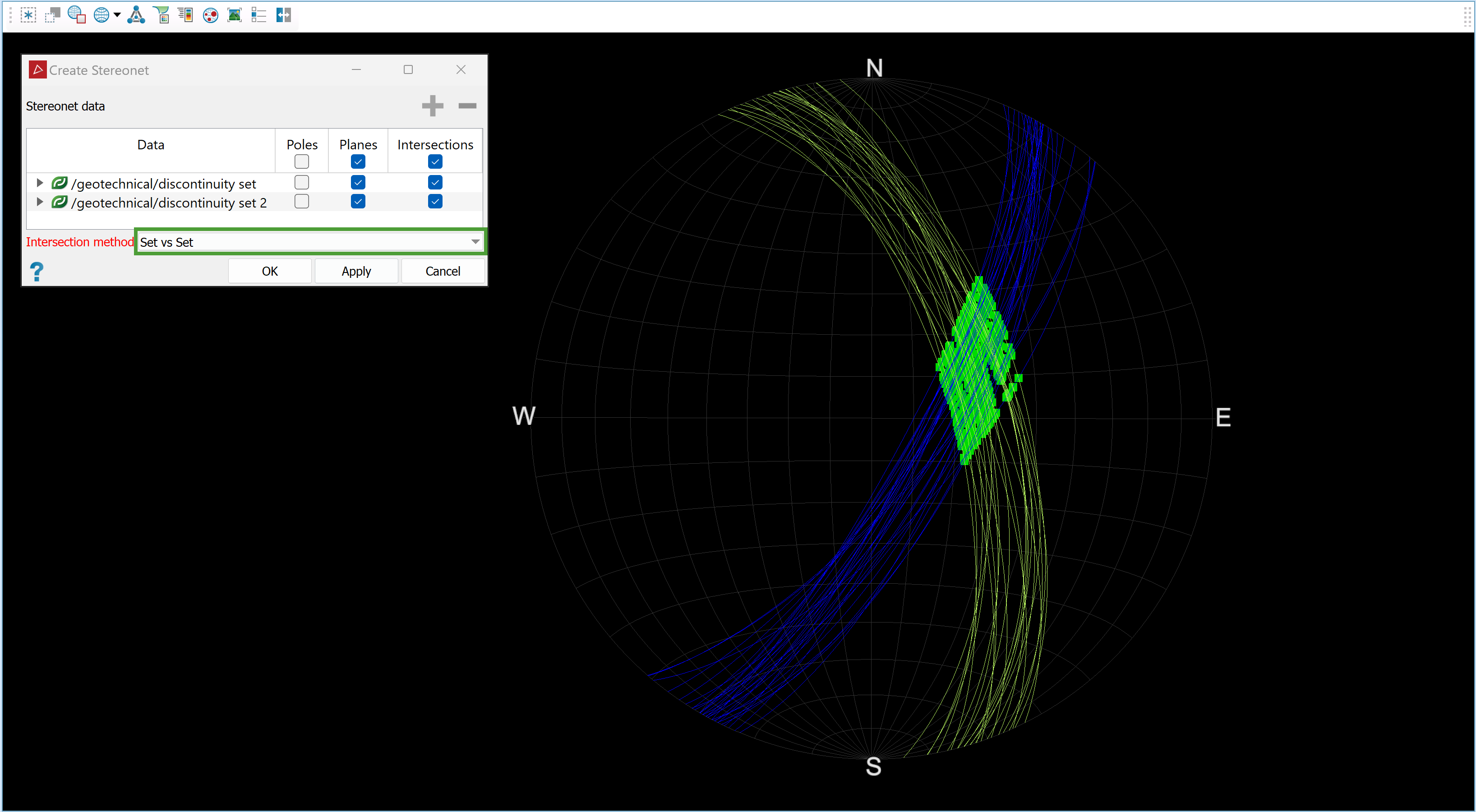 Set vs Set: The stereonet tool will generate intersections between discontinuities from different sets, but not between discontinuities in the same set.