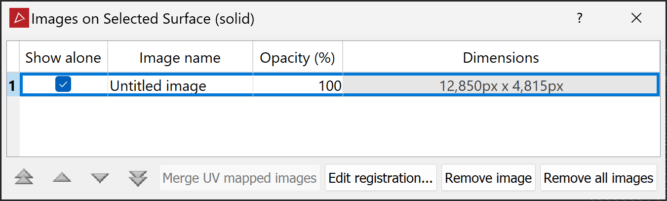 The Image Manager allows you to manage imported images that have been overlaid on a scan or surface. The images may have already been imported and applied to a surface. You can adjust opacity, remove the image, or edit the position of the image on the object's surface.