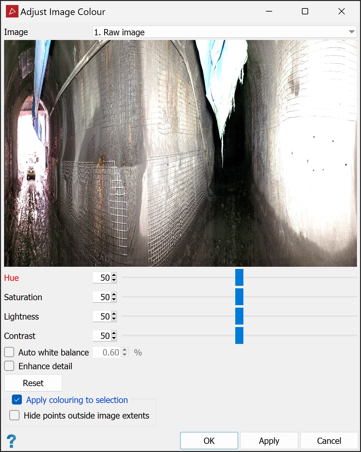 Select Hide points outside image extents so that only points coloured by the photographic image are visible. Points outside the image extents are coloured in greyscale, then hidden from view.