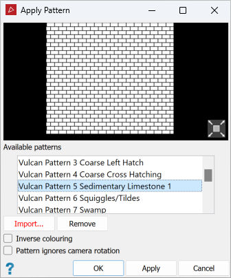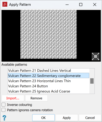 The Apply Pattern tool enables you to apply a texture-fill pattern to a surface, such as those used in geological face maps to denote rock types.