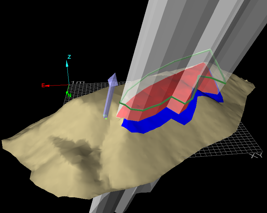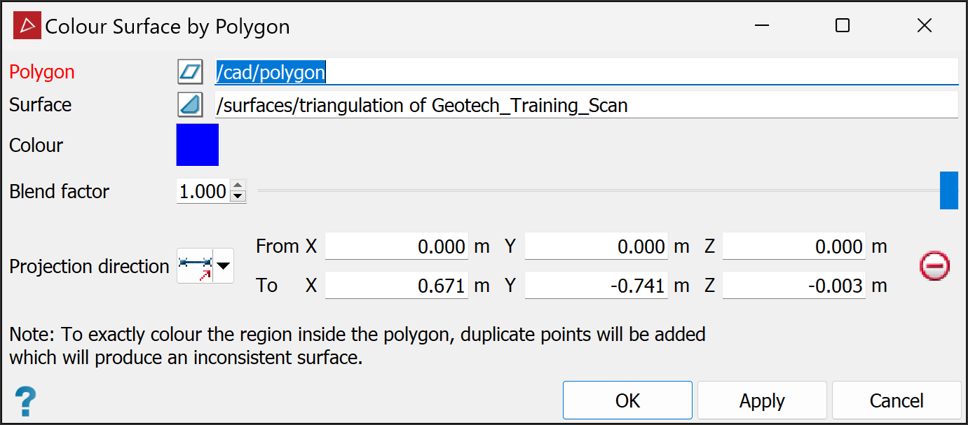 The Colour Surface by Polygon tool enables you to use the projection of a polygon to apply a colour to a surface. Different methods of projection are possible to accurately define the region.