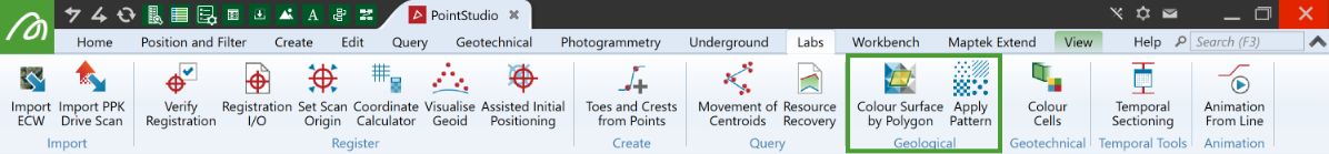 The Geological group on the Labs tab contains tools for highlighting areas on a surface according to rock types and other geological criteria.