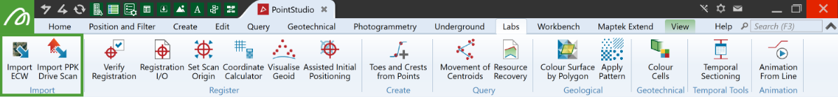 The Import group tools on the Labs tab enable you to import data from secondary Maptek projects and other external data, and to export data for other applications.