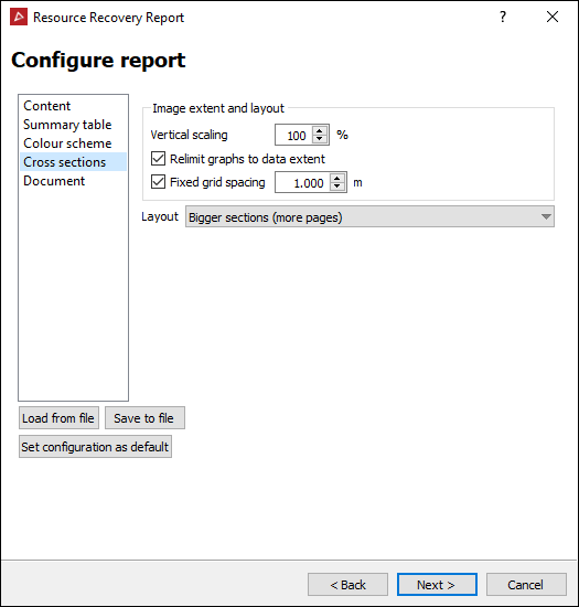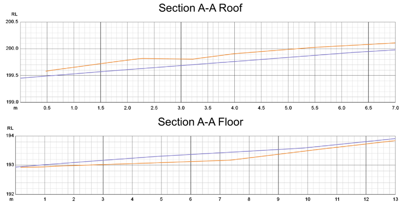 Cross sections: Set up section graphs detailing differences between design and surveyed surfaces.