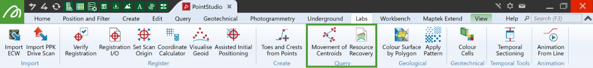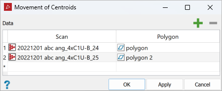 The Movement of Centroids tool determines the movement direction of the centroid of a region of points from one scan to the next. The region is defined by polygons created around the areas of interest.