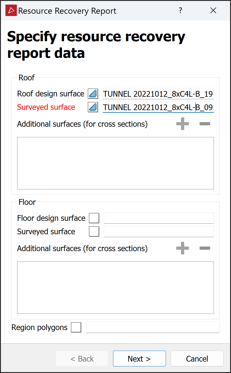 Roof Design surface and surveyed surface Floor Design surface and surveyed surface Region polygons For isolating information about regions within the material zone. Can be a single polygon, container of several polygons, or a container of edges representing block lines. If not specified, regions can be automatically generated in a subsequent step. Additional surfaces (for cross sections) Applying to roof and floor. These will not affect calculations. -