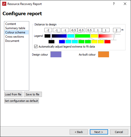 Colour scheme: Configure the colour scheme to display heat maps showing loss and dilution amounts on roof and floor views. See Modifying a Colour Scale for detailed instructions.