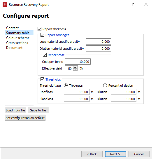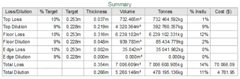 The Resource Recovery report tool compares design (roof and floor) surfaces with surveyed (roof and floor) surfaces for any resource that approximates horizontal, layered zones (e.g. sedimentary material). The report generates conformance data including loss and dilution quantities calculated at the floor and roof boundaries. Loss refers to resource material that is missed by the mining process. Dilution refers to unwanted neighbouring material that is mixed in with the resource material.