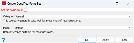 Mode Description Applicable categories Preview This mode skips densification; the sparse point cloud is treated as the dense point cloud. General, Aerial/Nadiral, Urban, Surface scan Default Default settings for most use cases. General, Aerial/Nadiral, Urban, Surface scan High details Higher resolution than the default setting. Use this setting when the Default mode result is unsatisfactory. General, Aerial/Nadiral, Urban, Surface scan, Vertical structure Ultra Fine resolution and very slow mode that should be used only in very specific cases. Surface scan, Vertical structure -