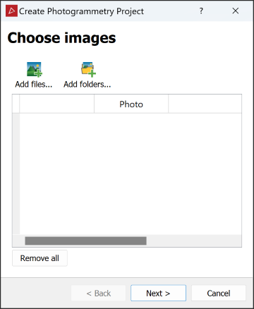 New.The Create Photogrammetry Project panel will open on the Choose images page.