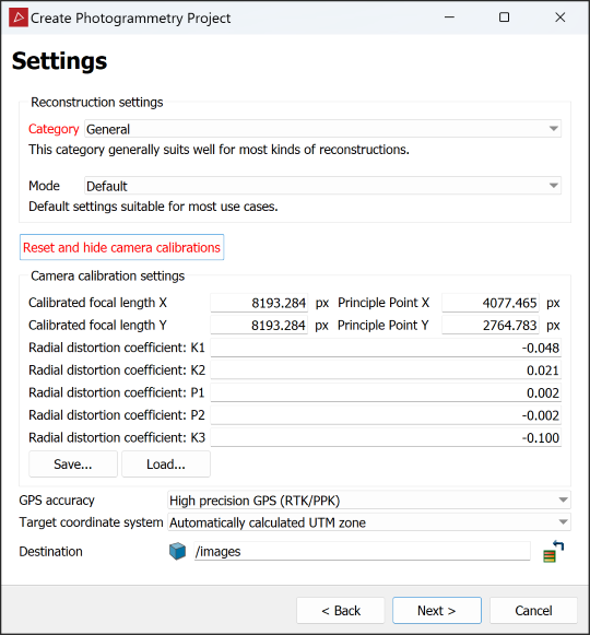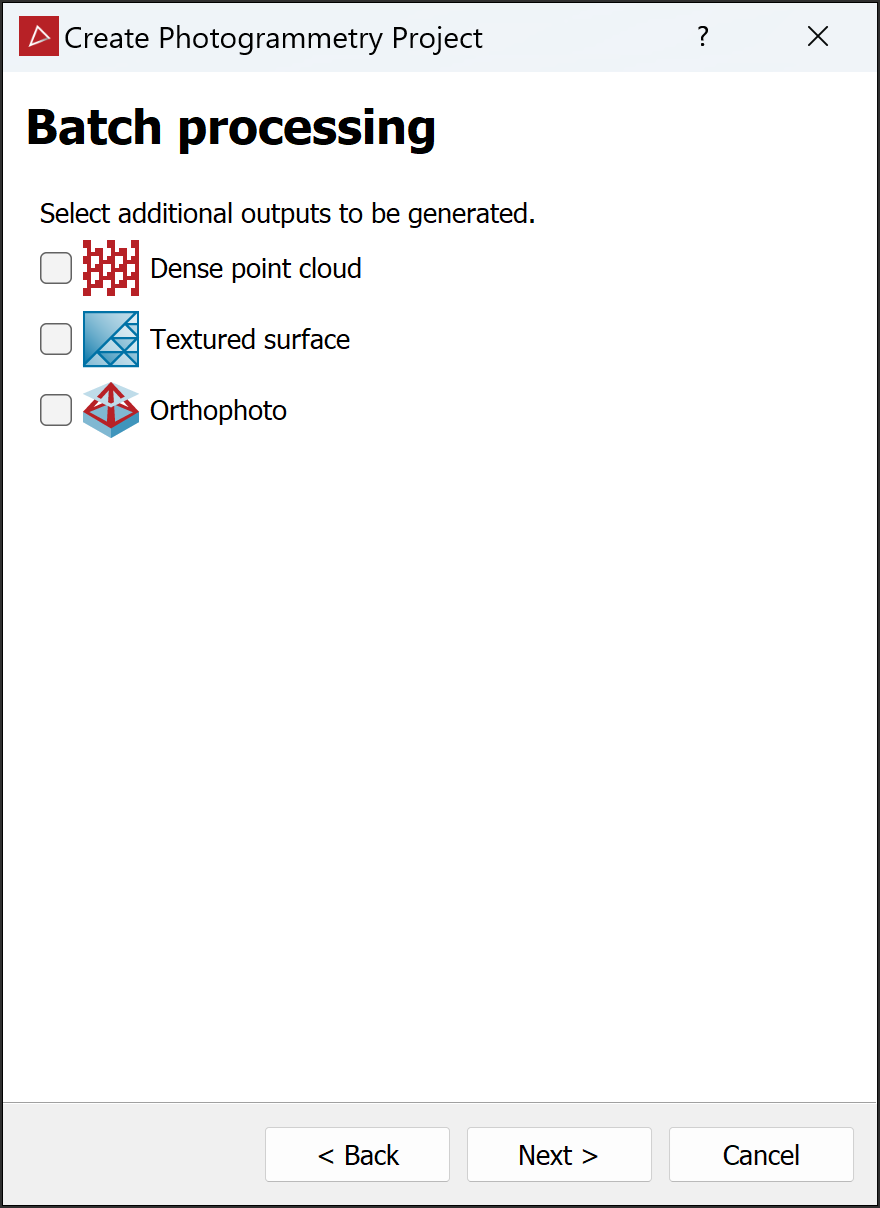 Note: If no selected images contain GPS camera positions, the Batch processing page will not appear. The New tool will process the images to create the reconstruction immediately.