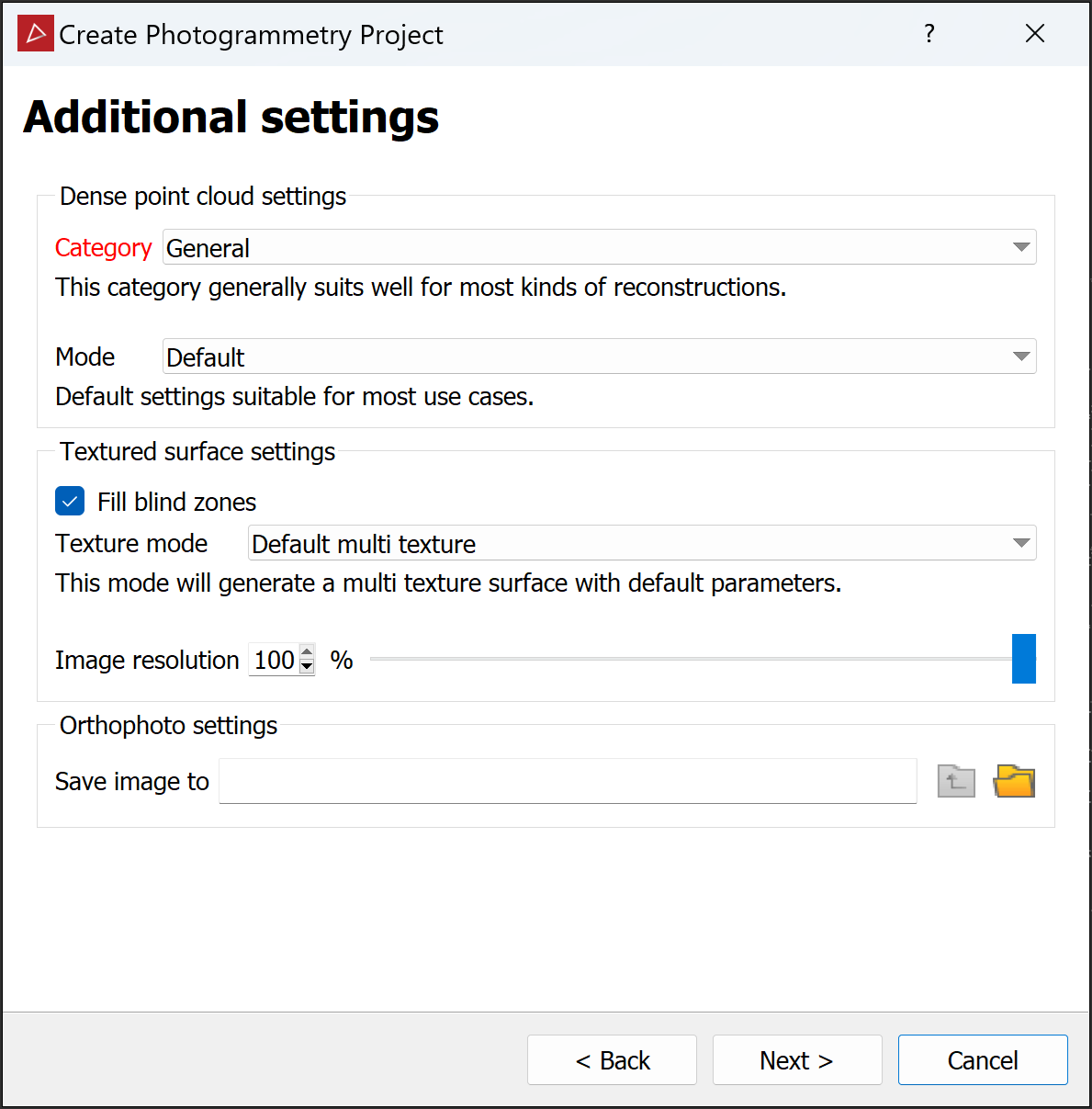 General For reconstruction projects where other options don’t apply. Aerial/Nadiral For reconstructing a top-down view scenario, typically a UAV drone-acquired dataset. Urban For reconstructing buildings, façades, or scenarios that are shot in an urban setting. You can use this category for small objects instead of the Surface scan category if you are mixing different types of photos, especially if the whole dataset is not shot from the same distance. Surface scan For reconstructing surfaces close up (e.g. terrain or ground). Vertical structure For reconstructing telecommunication towers or other thin vertical structures from drones. -
