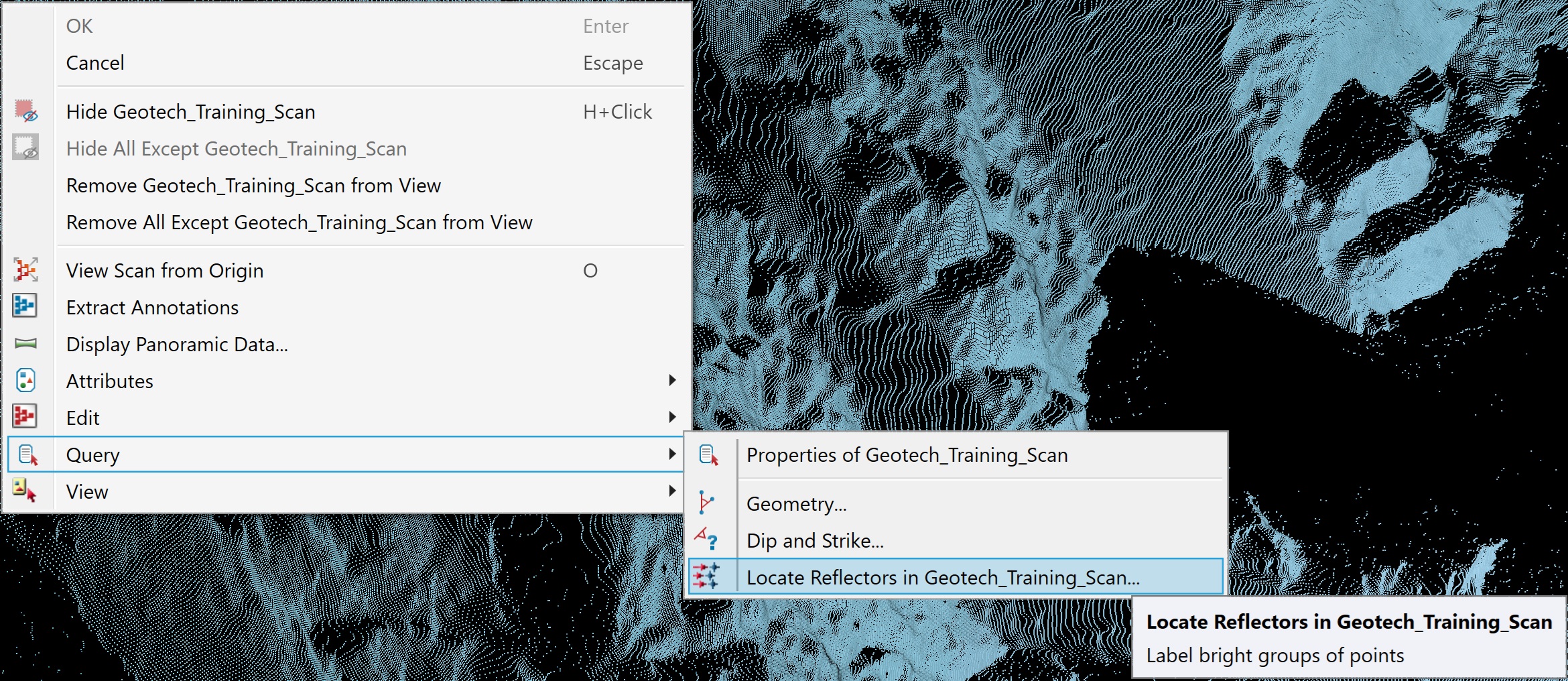 The Locate Reflectors tool is only available from the view window object context menu; it is not found on any tool ribbon. It will find and flag any reflectors found in a scan. Reflectors