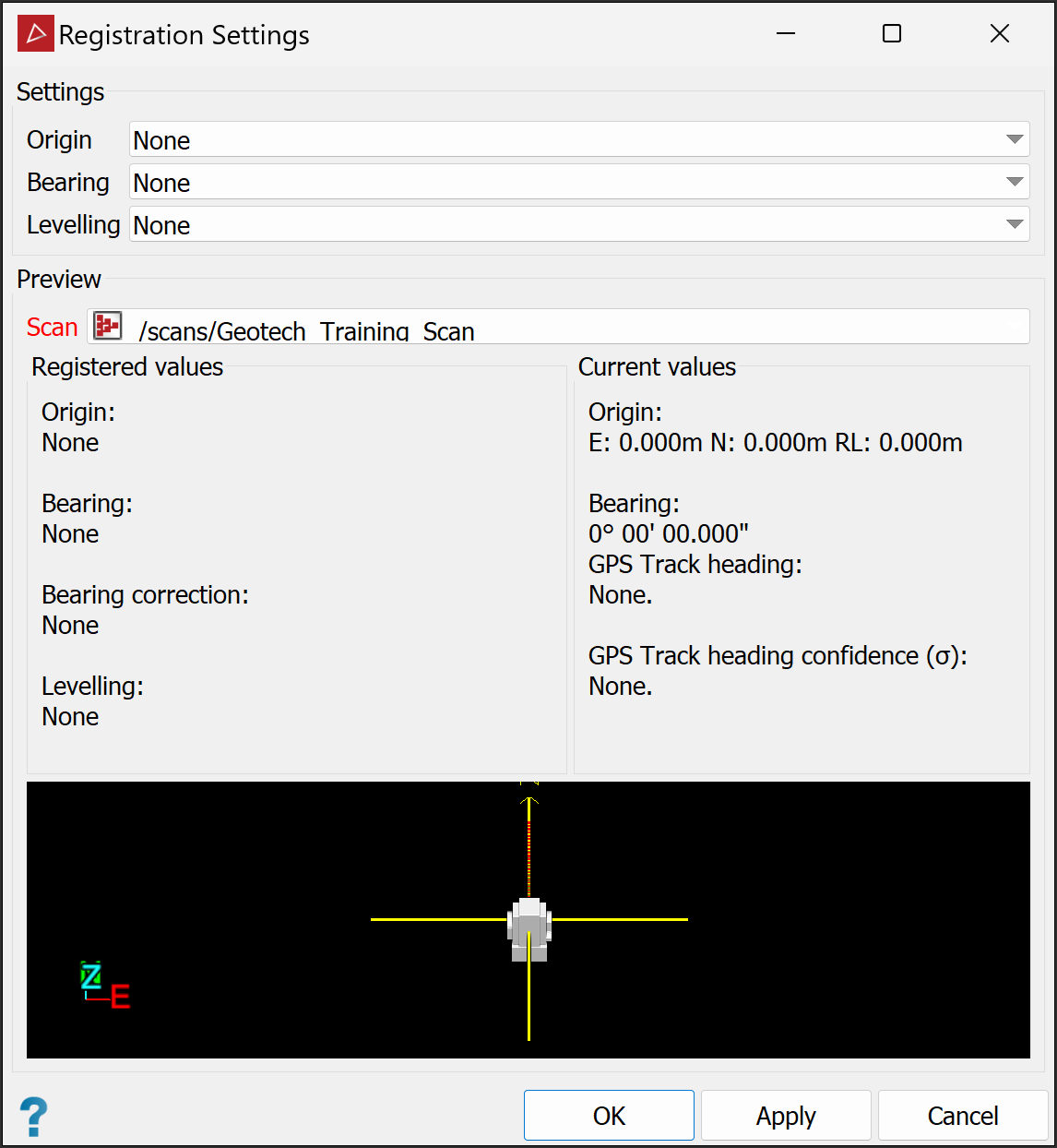 The Registration Settings tool (Position and Filter tab > Register group) displays registered and current position and orientation values for the origin of a scan. Where available, you can also select options for origin, bearing, and levelling sources for registration purposes. A 3D diagram shows the registered values with respect to the scanner body. This tool provides a handy way to check and adjust registration data for scans.