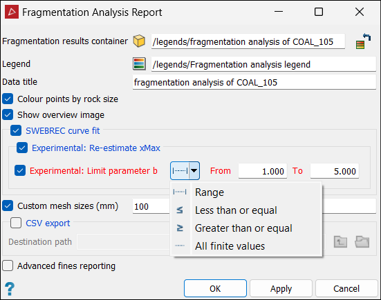 (Optional) Select SWEBREC curve fit to display the fragmentation size distribution in a graph. Leave the Experimental: options cleared to use the standard SWEBREC formula.