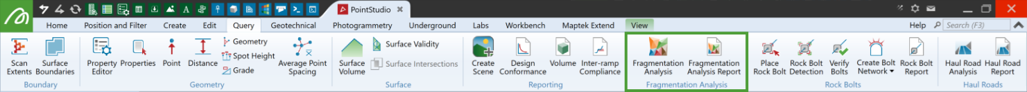The Fragmentation Analysis tools on the Query tab enable you to analyse and report on blast fragmentation using automated rock size detection and analysis from muck pile scans.