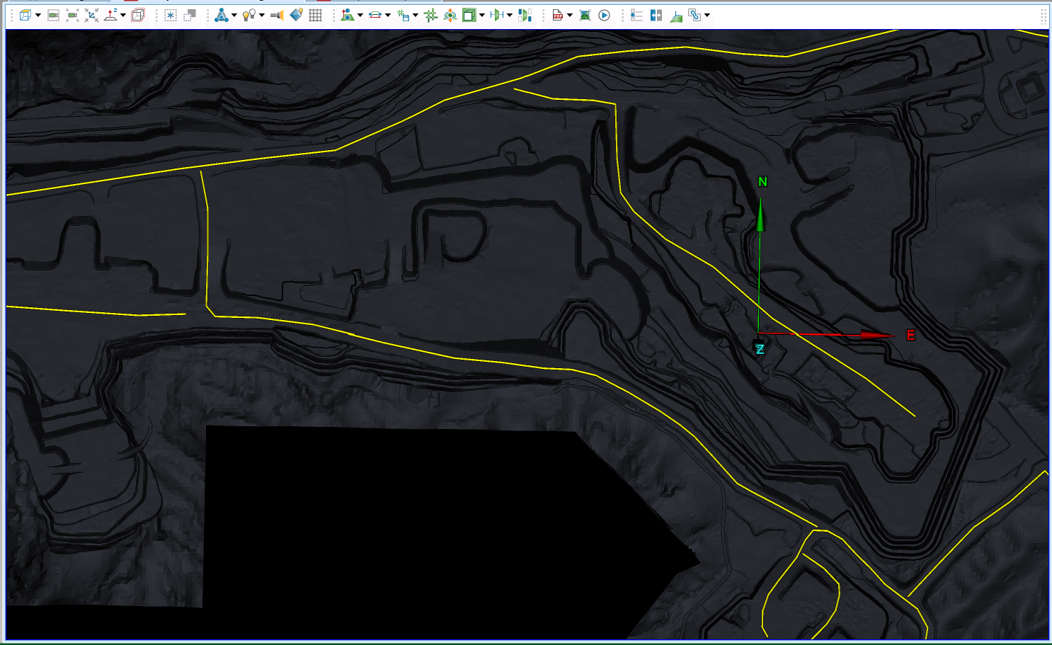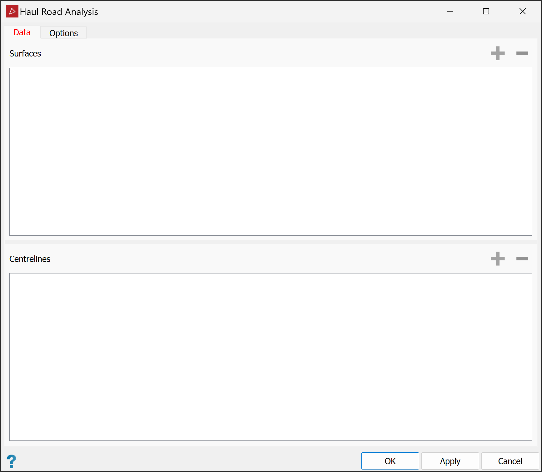 To populate the Data panel, select the surfaces or triangulations of the mine site and the centre lines of the road In the project explorer.