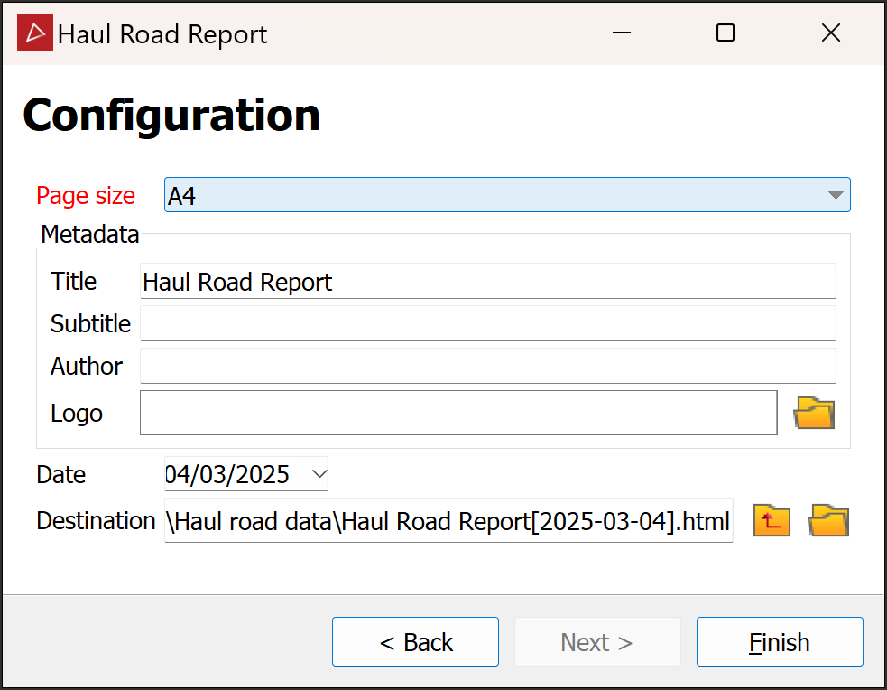 The Haul Road Report tool enables you to generate a report from the haul road analysis results, including images and graphs, that can then be exported to PDF or a CSV format.