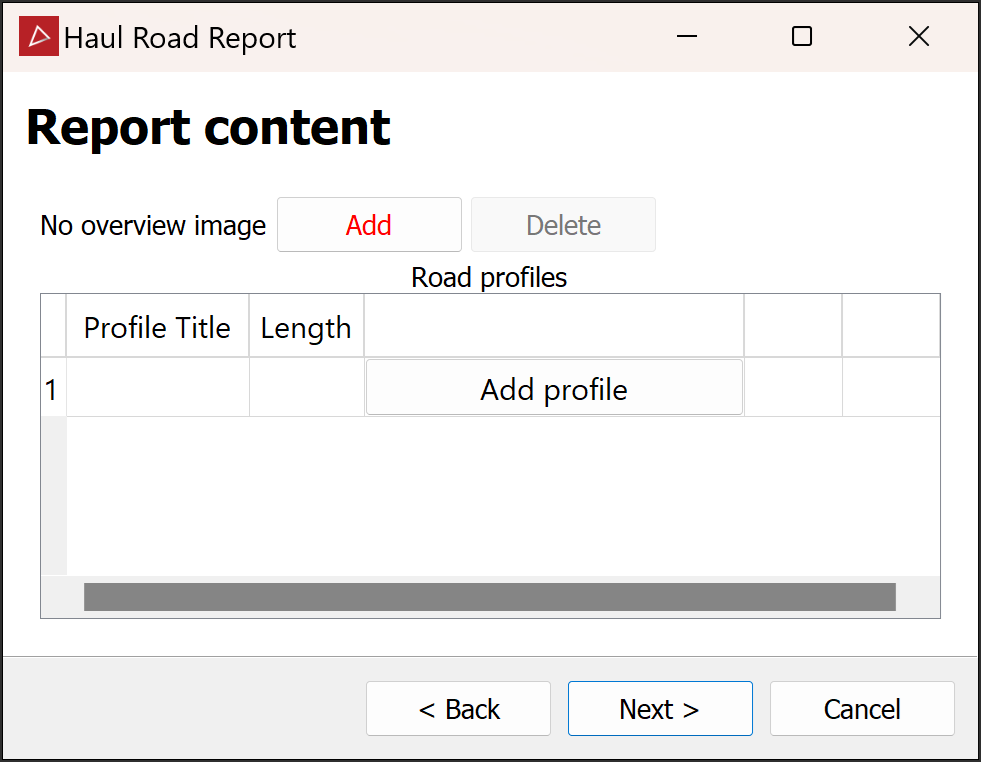 Add sections of interest to the Road profiles table. Click Add profile in the first available row, then pick the start and end points in the view window. Manipulate the view as necessary. The profile will be added to the table. For each road profile in the table, the following options become available: