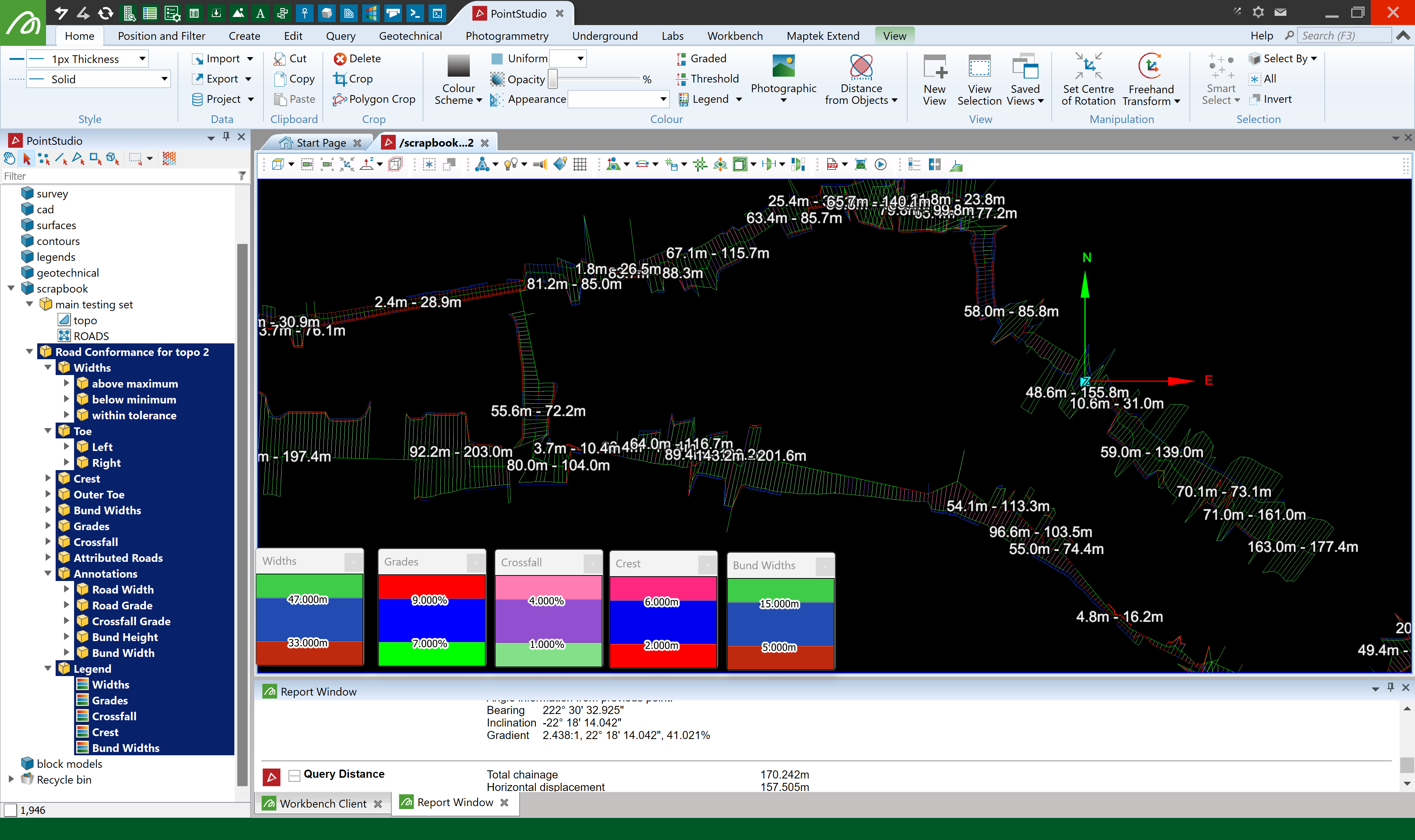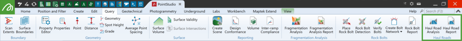 The Haul Roads tools on the Query tab analyse and report on haul roads to assist with design and construction, and maintenance.