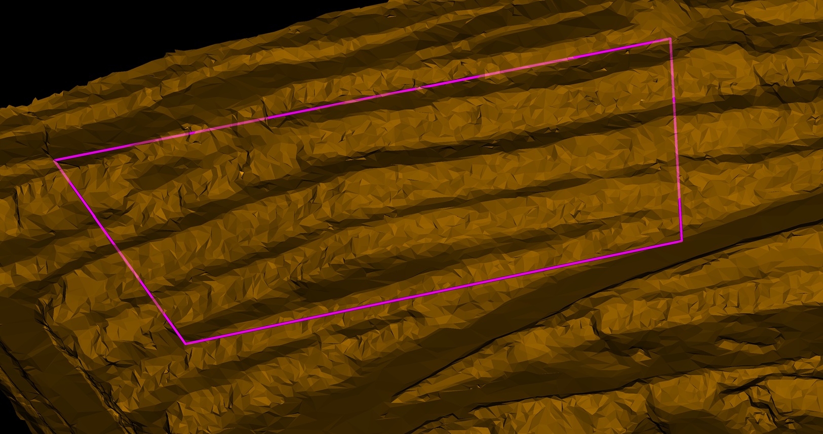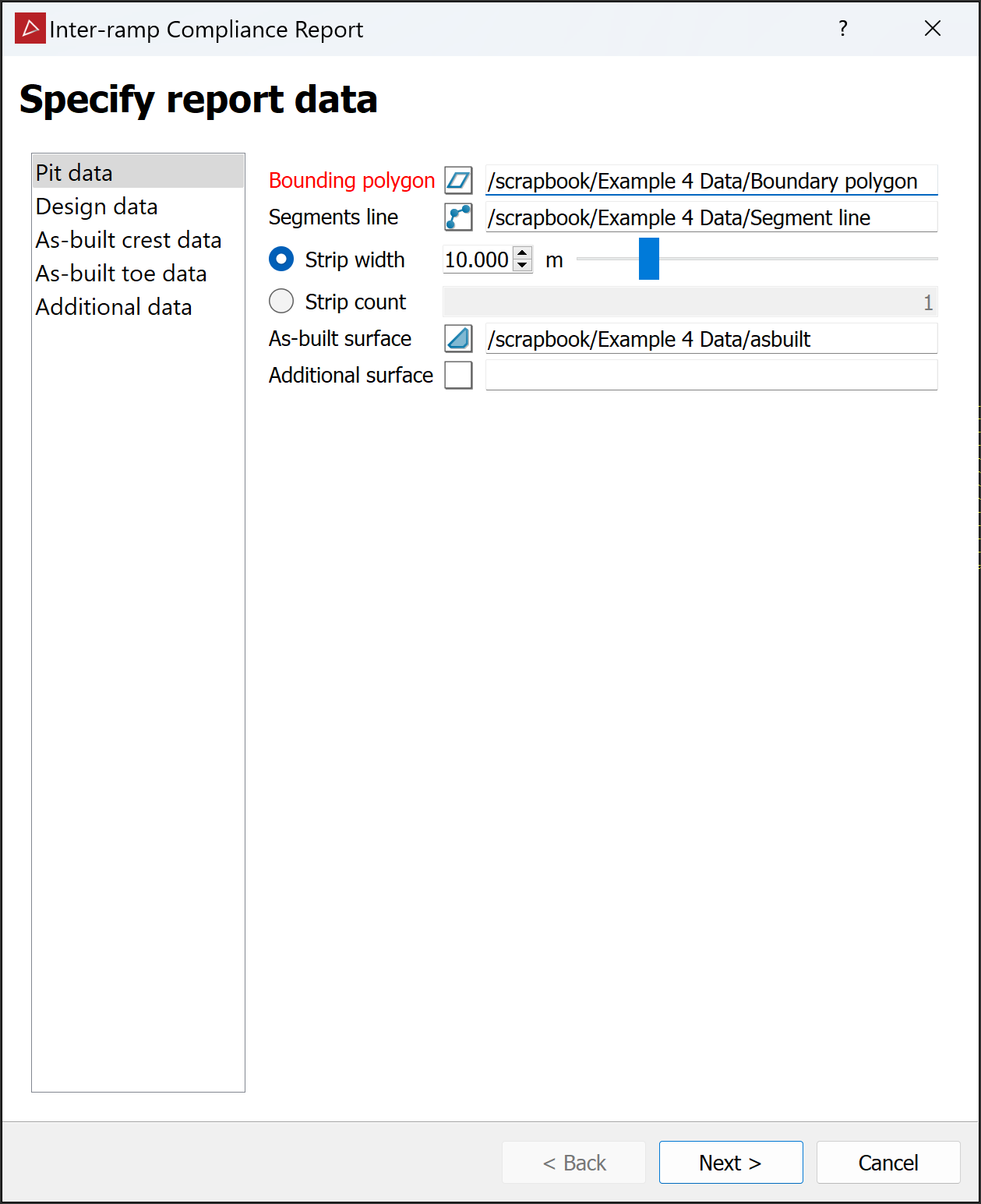 Note:  As soon as you add the bounding polygon and segments line, you will see a visualisation of the compliance report area and strip network in the active view window. The visualisation is placed horizontally at the highest elevation point of the bounding polygon. The visualisation is not saved as an object in the project.