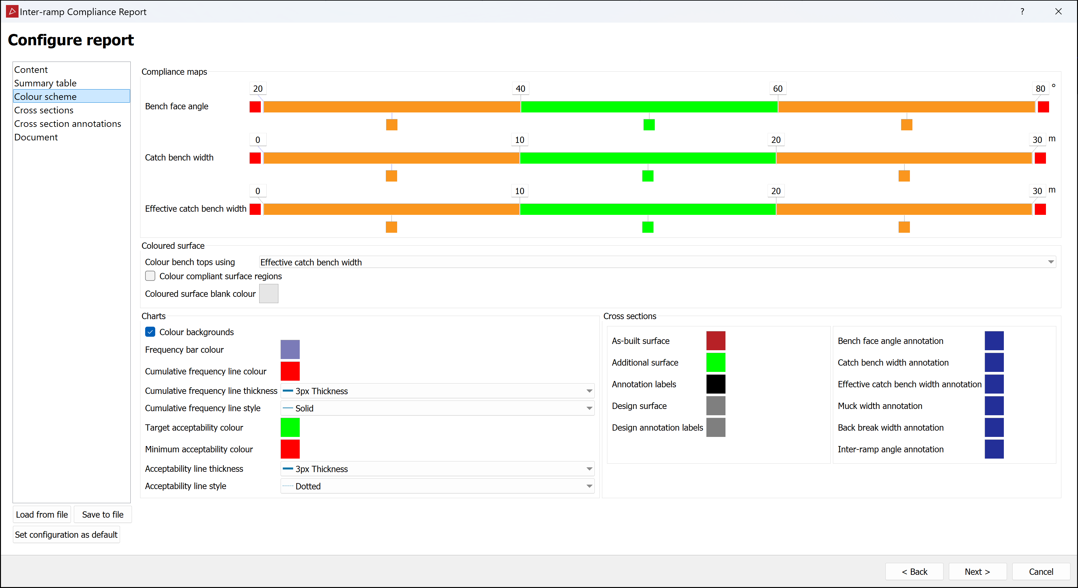 • Colour scheme: Set up the colour schemes to be used for the output objects and report.