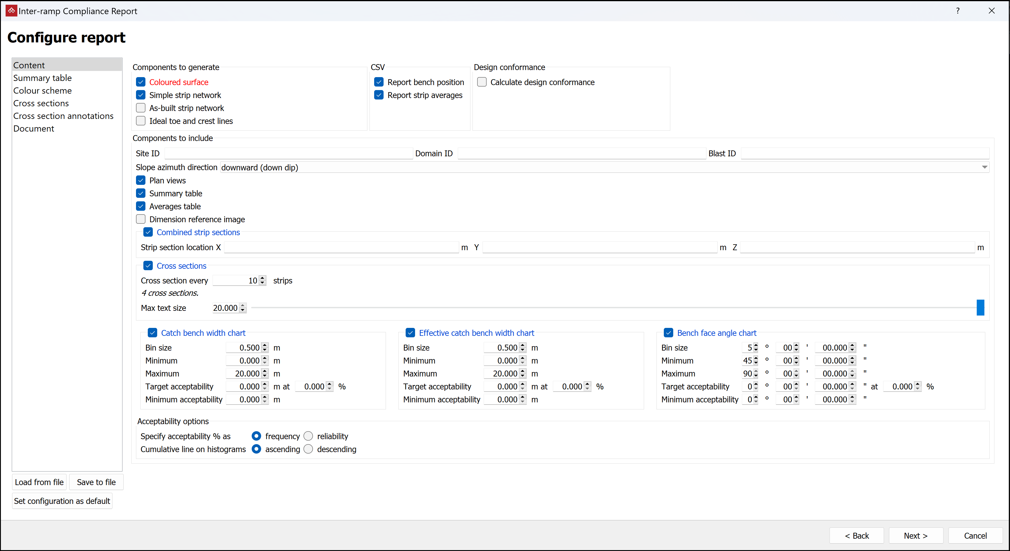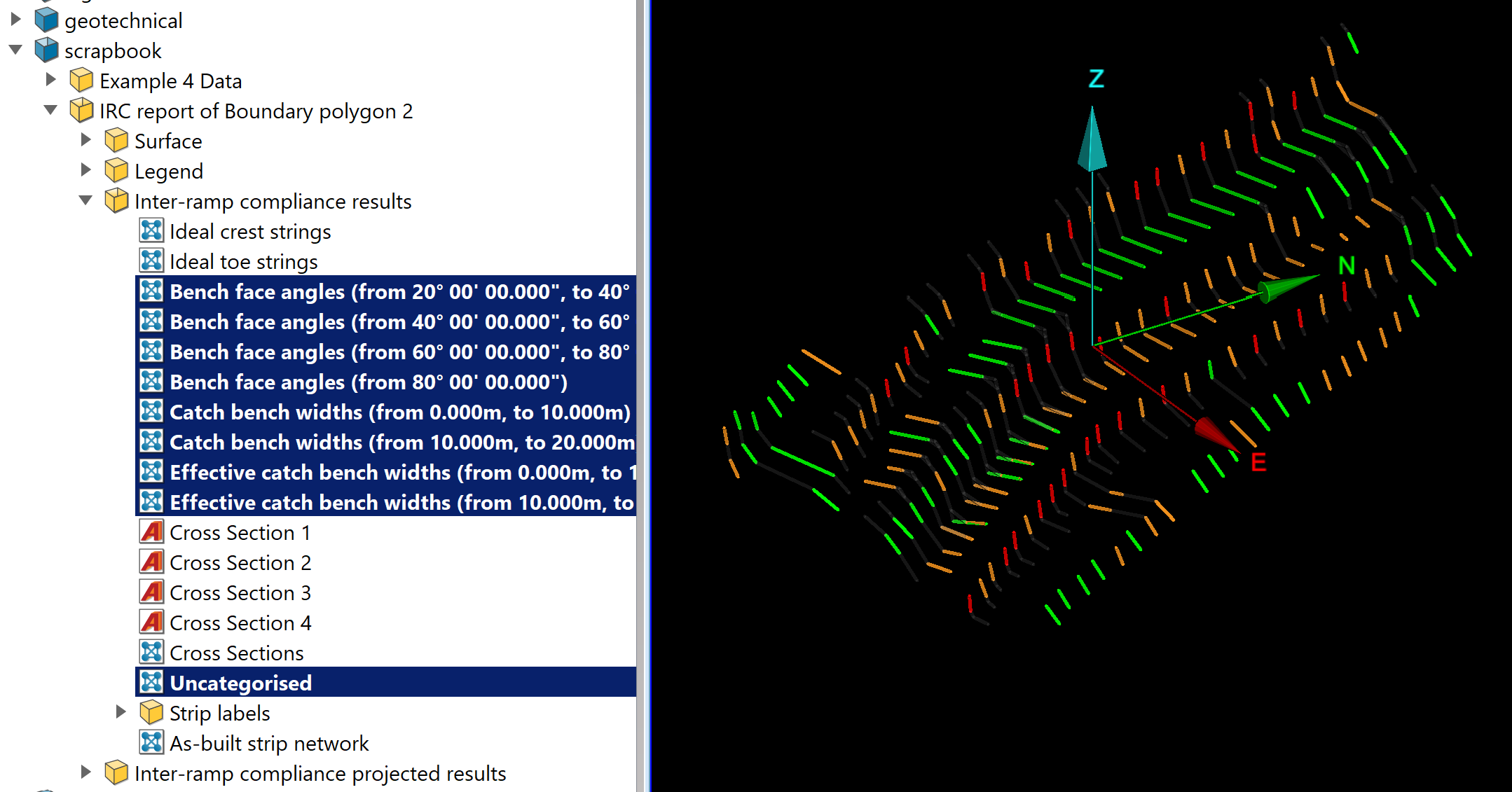 The Inter-Ramp Compliance reporting tool (Query tab > Reporting group) enables you to analyse bench face angles and catch bench widths, then generate reports detailing the compliance with site specific tolerances.