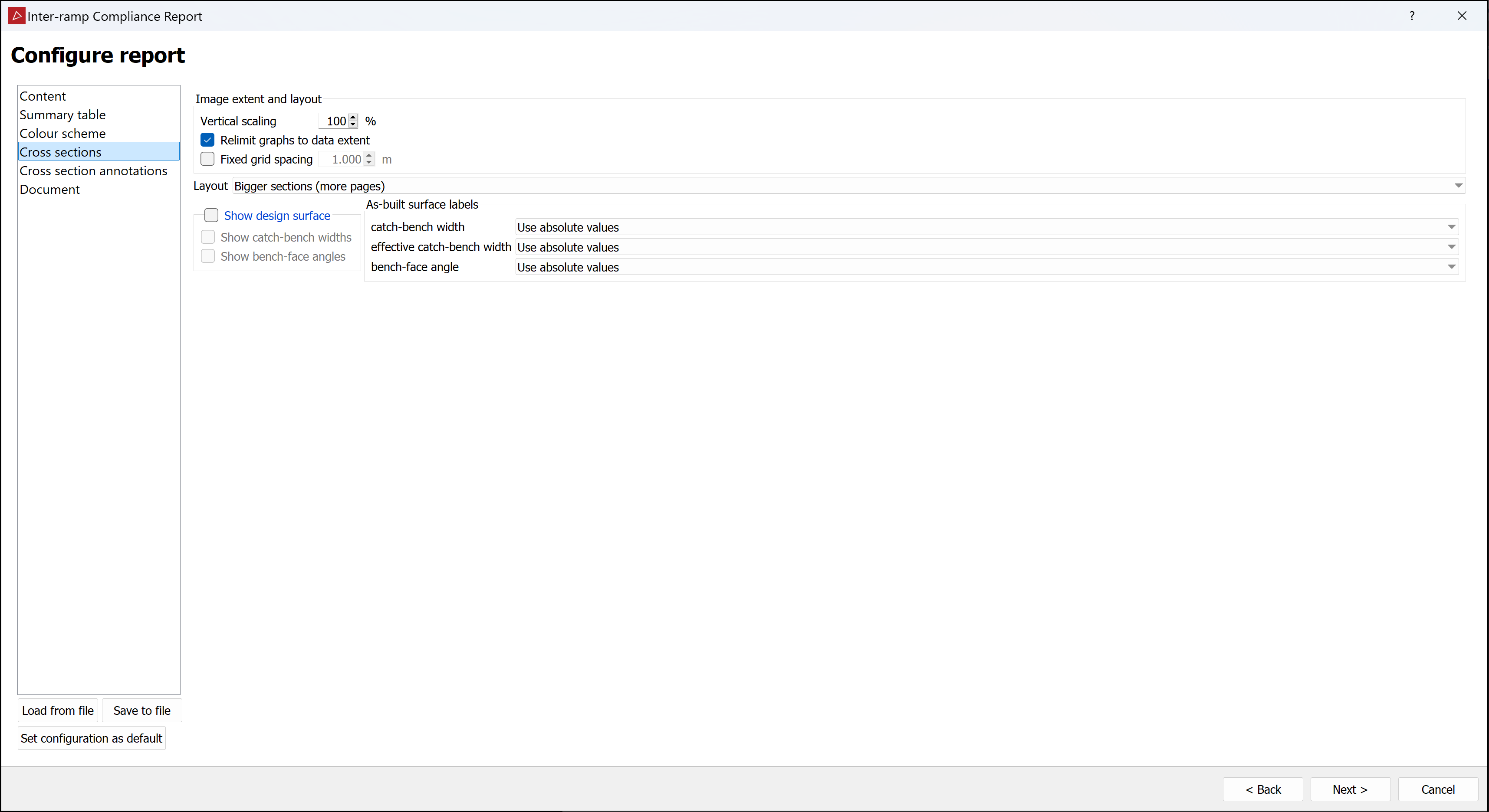 • Cross section annotations: Select the cross section annotations required for the report and clear those not required.