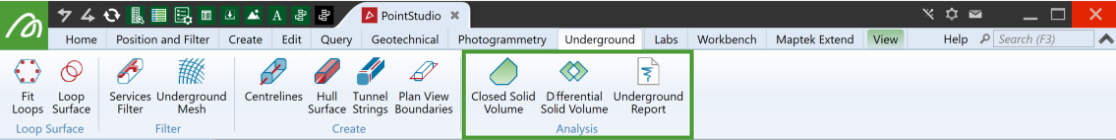 2. On the Underground tab, in the Analysis group, select Closed Solid Volume.