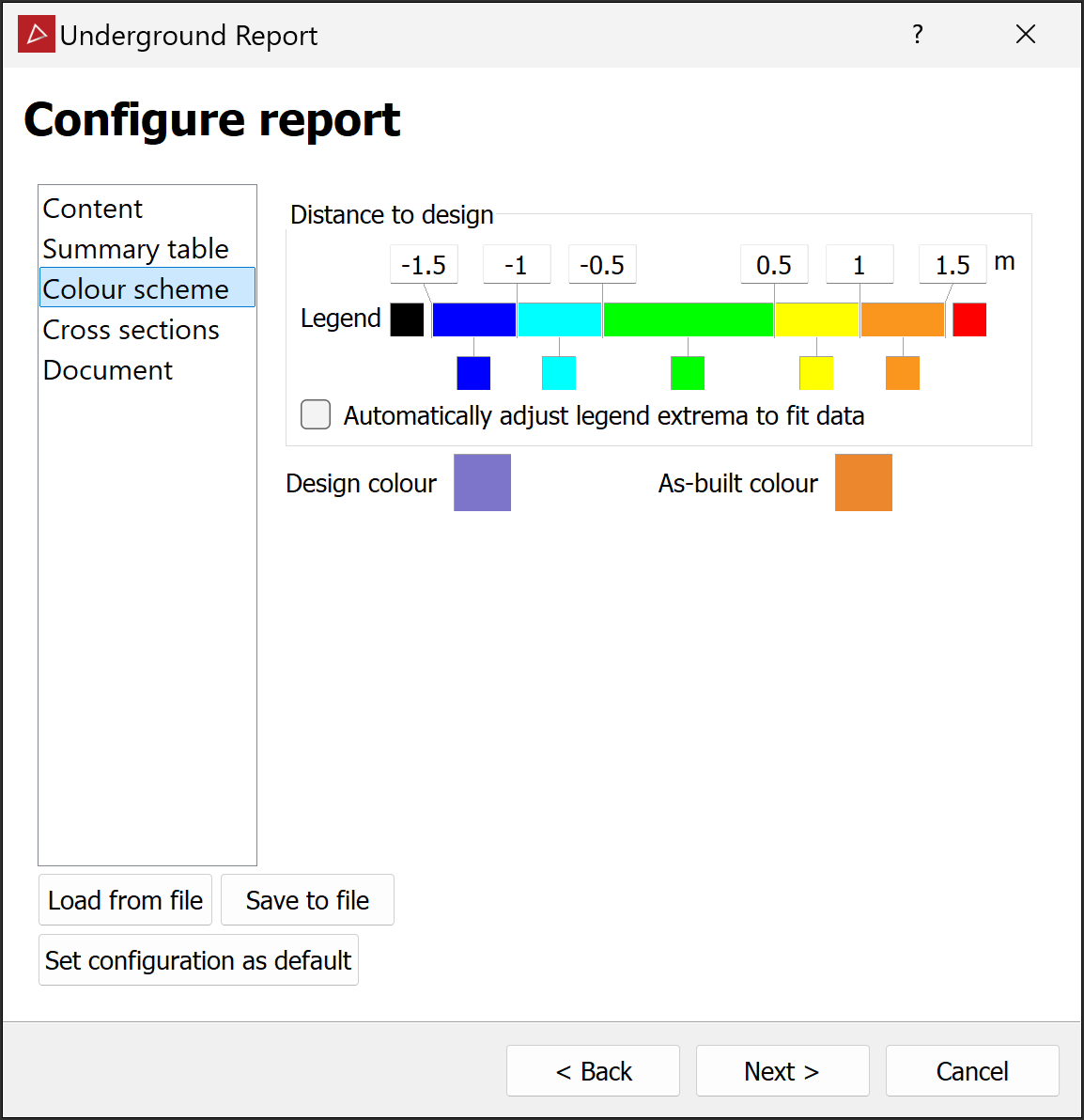 Note:  The values in the colour scheme are used to define the increments in the results table of the output. Solids are also created based on the underbreak and overbreak increments used in the colour scheme. These are checked later, after analysis, in order to validate results. In the case of no noticeable results, you can adjust the values can to show details at the level of the variation for the case in hand.