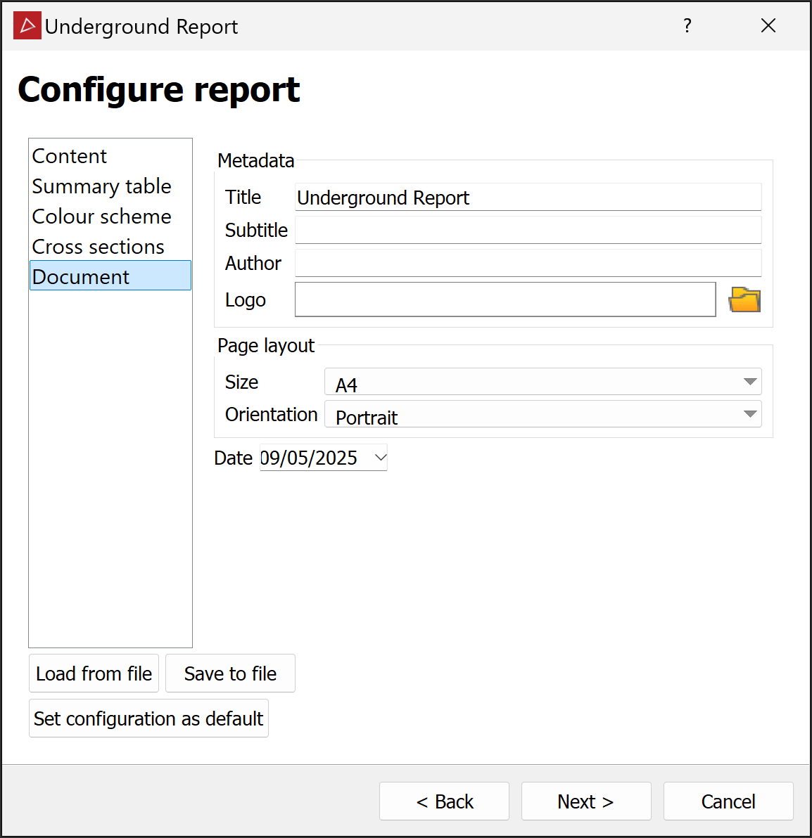 5. Document. Enter metadata to include (report title and subtitle, author's name, and logo) and a page layout. Change the date if necessary.