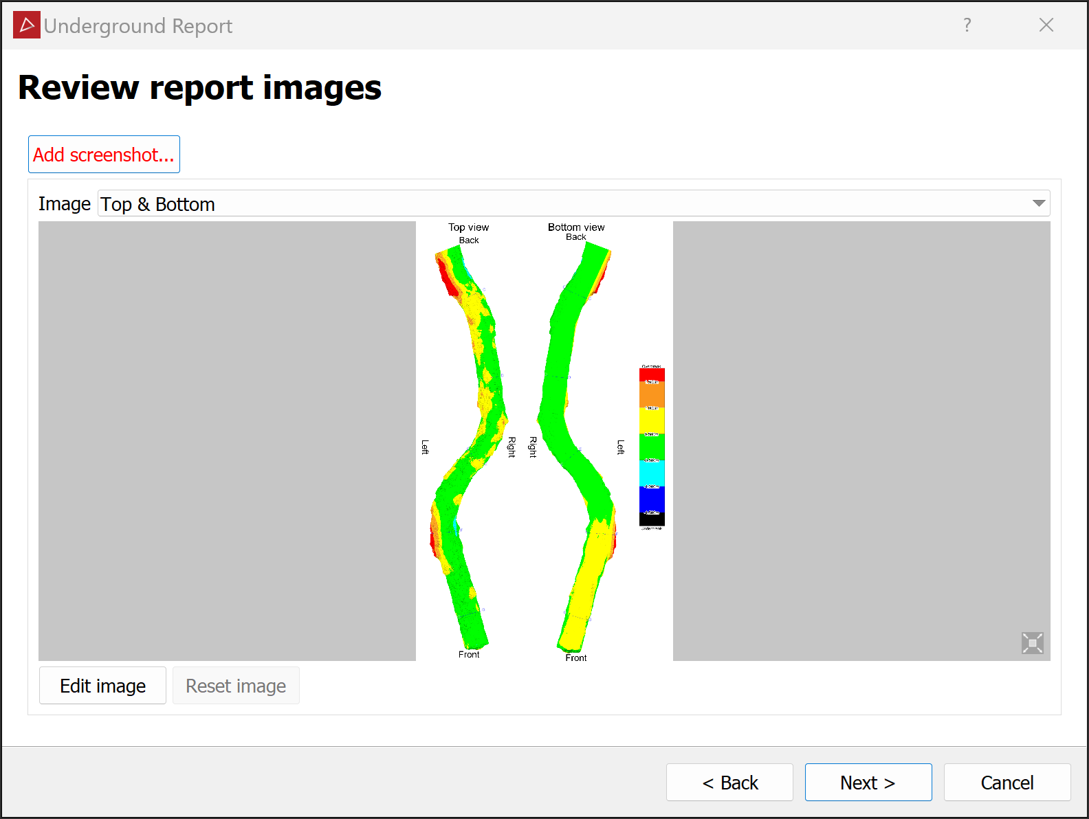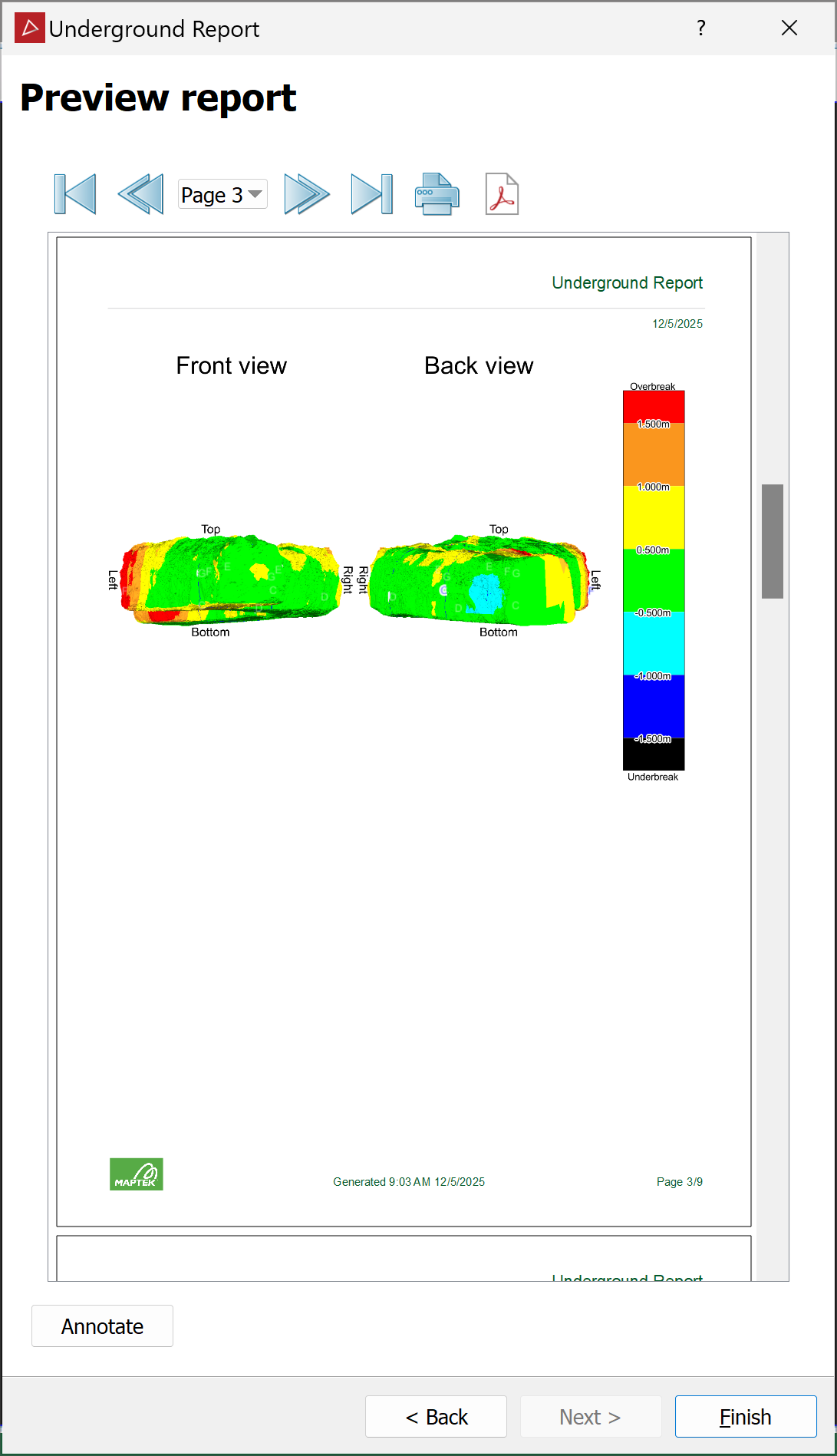 The report will display left, right, top, bottom, front and back views of the underground tunnel.