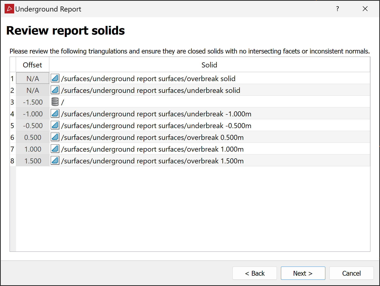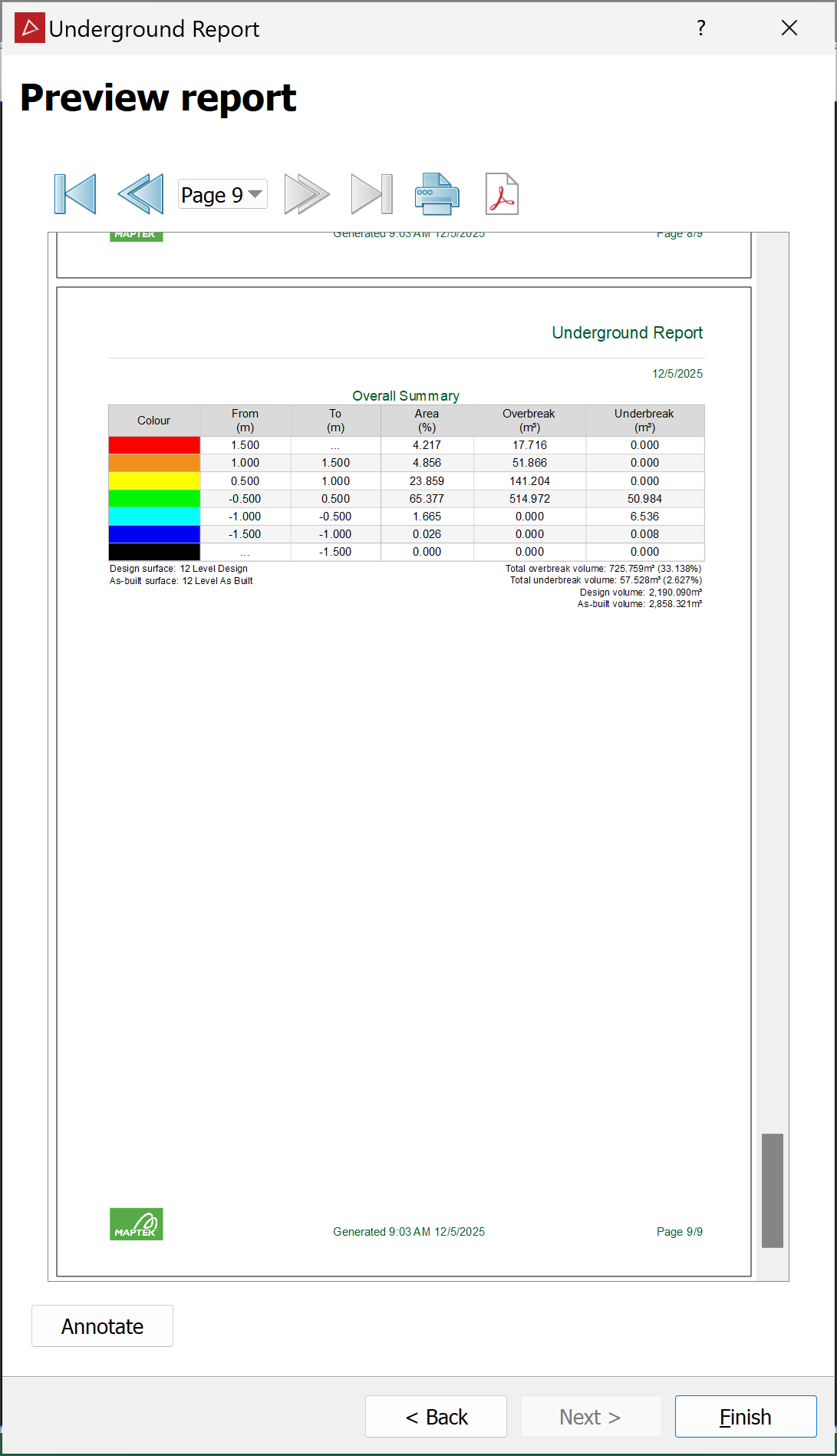 The Underground Report tool allows you to create reports detailing the conformance between the design surfaces of a tunnel or void, and objects representing the as-built surfaces (all with ends). These reports are useful for determining the amount of underbreak and overbreak resulting from digging or shotcrete application thickness.