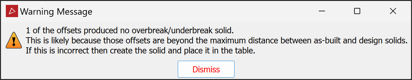 8. The analysis produces solids representing each of the overbreak and underbreak criteria as specified by the colour scheme setup. Leaving the report tool open, review each solid with the Surface Validity tool. Fix any errors found.