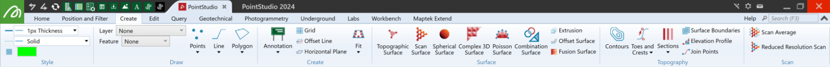 The Create tab hosts tools for creating CAD objects, surfaces, annotations, and topography objects.