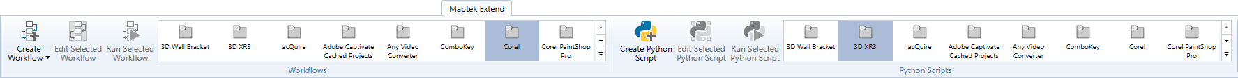 The Maptek Extend tab offers tools for creating Workflow components using Python scripting. These tools can be used along with the existing Maptek software components.