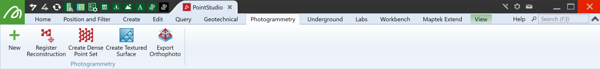 The Photogrammetry tab provides tools for converting 2D photographic images to point sets and then working with those point sets to reconstruct them as 3D photographic surfaces.