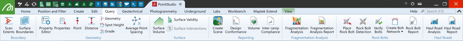 The Query tab hosts tools for analysing spatial objects, calculating dimensions and quantities, comparing as-built data with design, and generating detailed reports from the results.