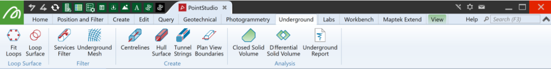 The Underground tab provides tools for modelling tunnels and other cavities.